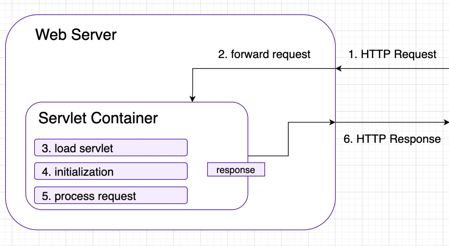 - 웹서버는 요청을 서블릿 컨테이너로 전달합니다.