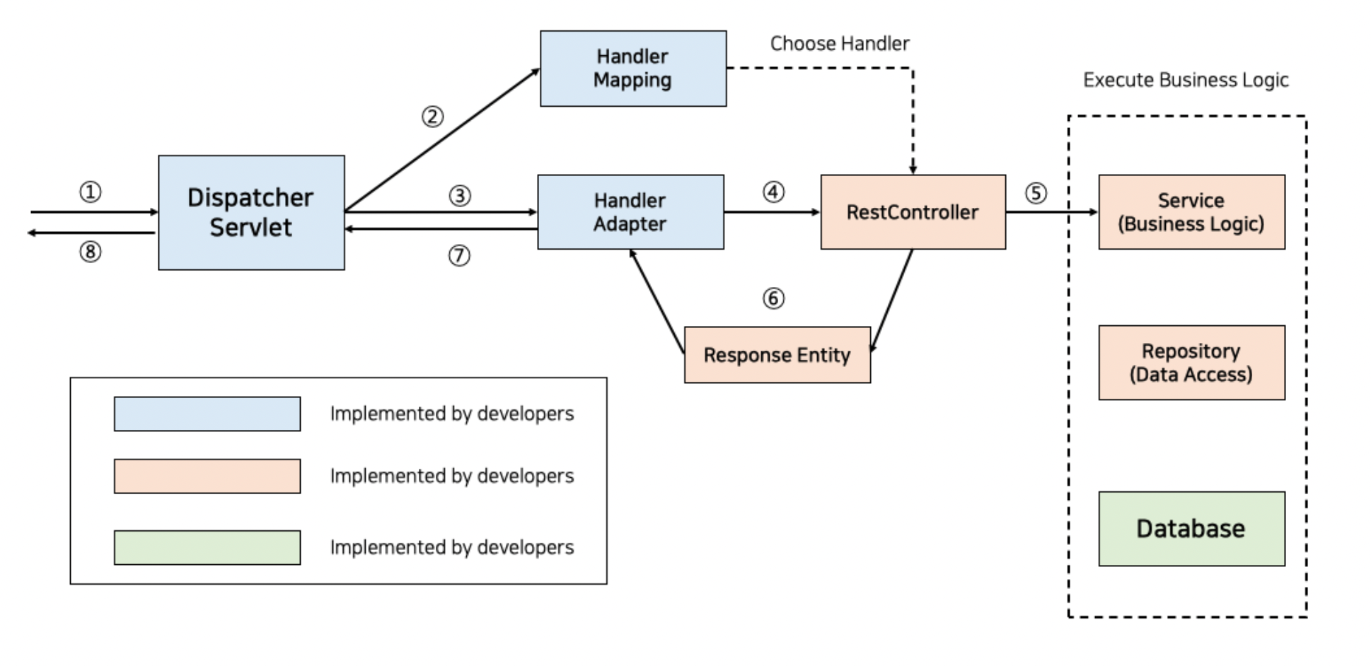 4. 핸들러 실행 : 핸들러 어댑터가 실제 핸들러를 실행합니다.