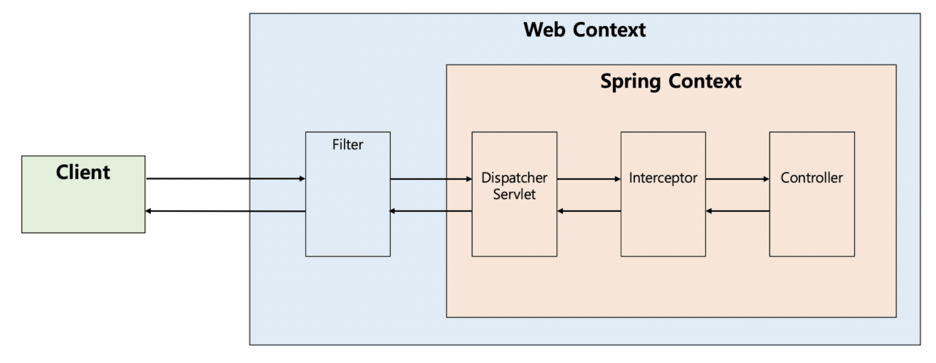 (실제로는 Interceptor가 Controller로 요청을 위임하지 않으므로 아래의 그림은 처리 순서를 도식화 한 것으로만 이해합니다.)