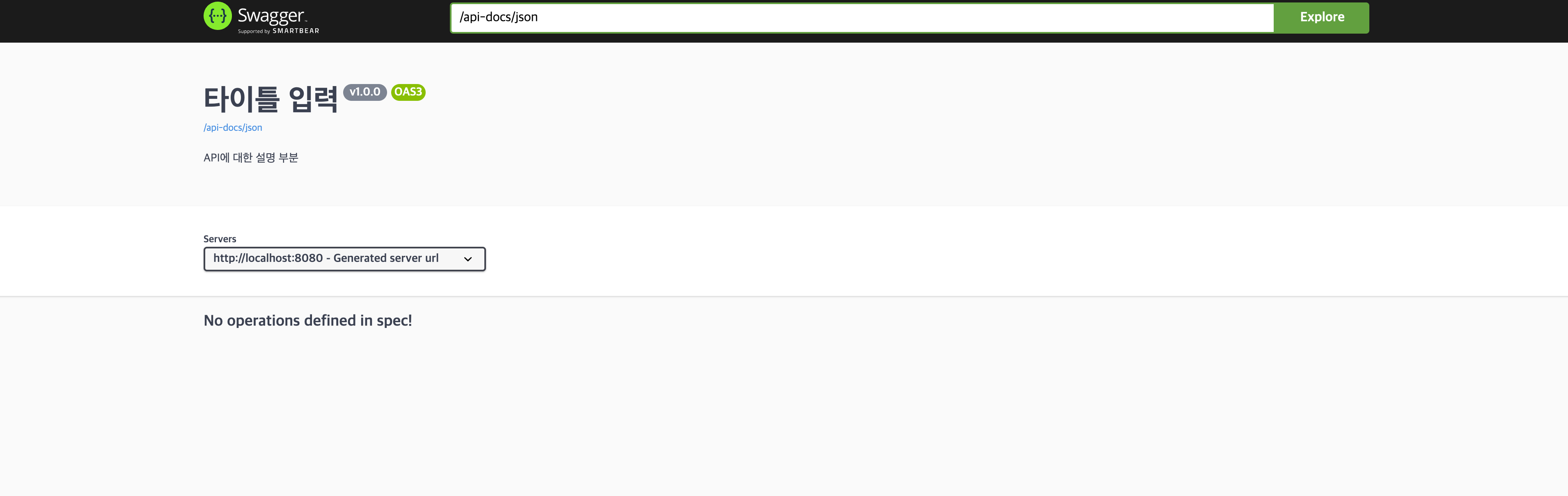 아래와 같이 No operations defined in spec! 이 발생하였습니다. 이는 springdoc 버전을 1.5.7로 내리니까 해결되었습니다!