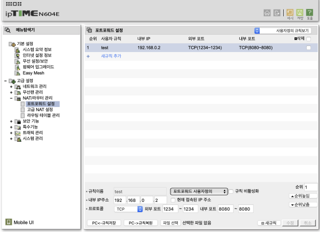 2. 왼쪽 메뉴탐색기에서 포트포워드 설정을 들어가  새규칙을 만들어줍니다.