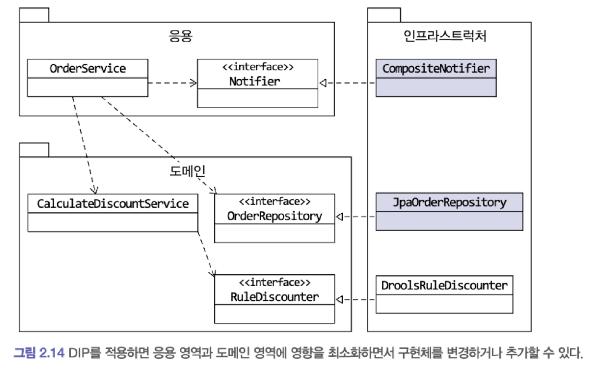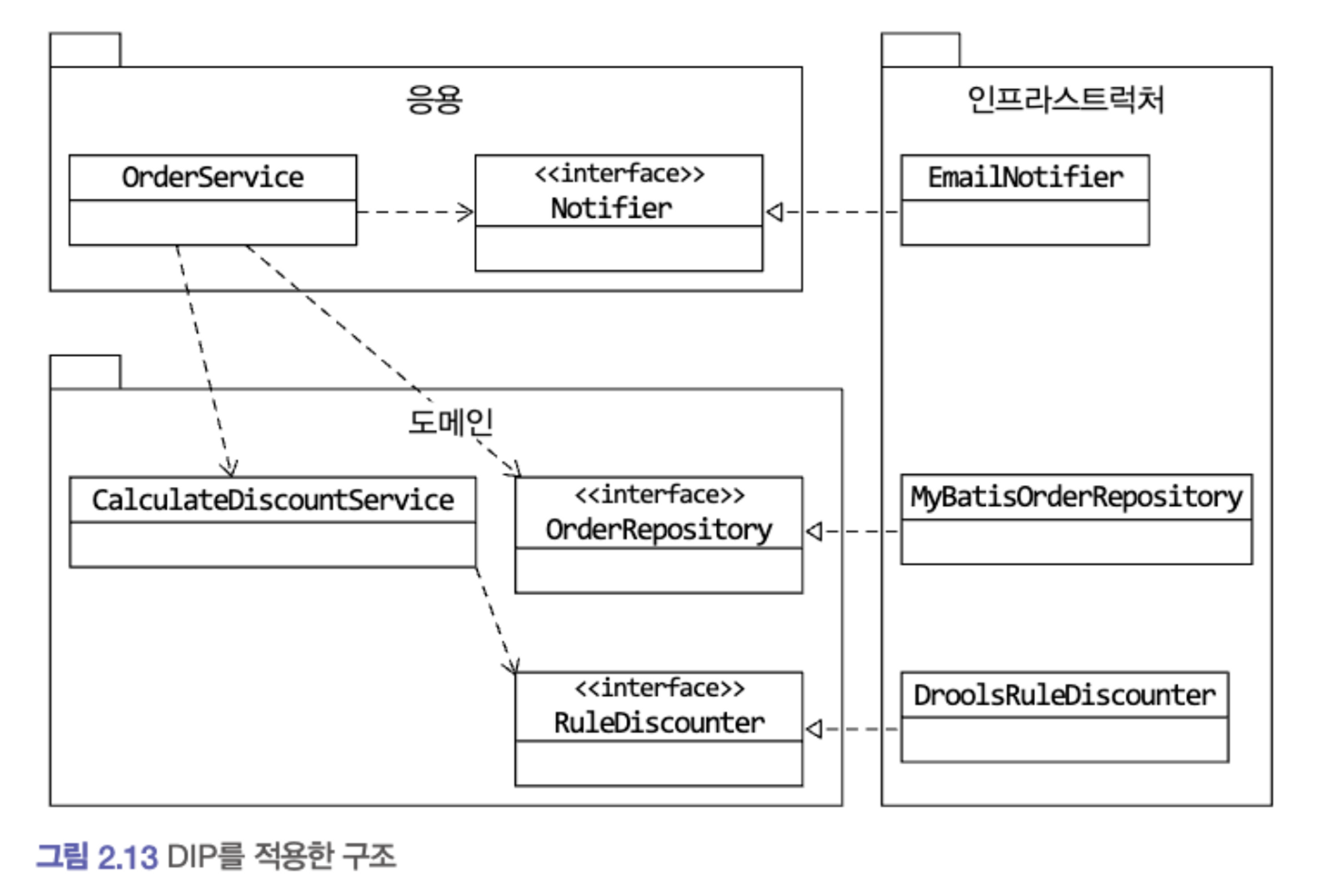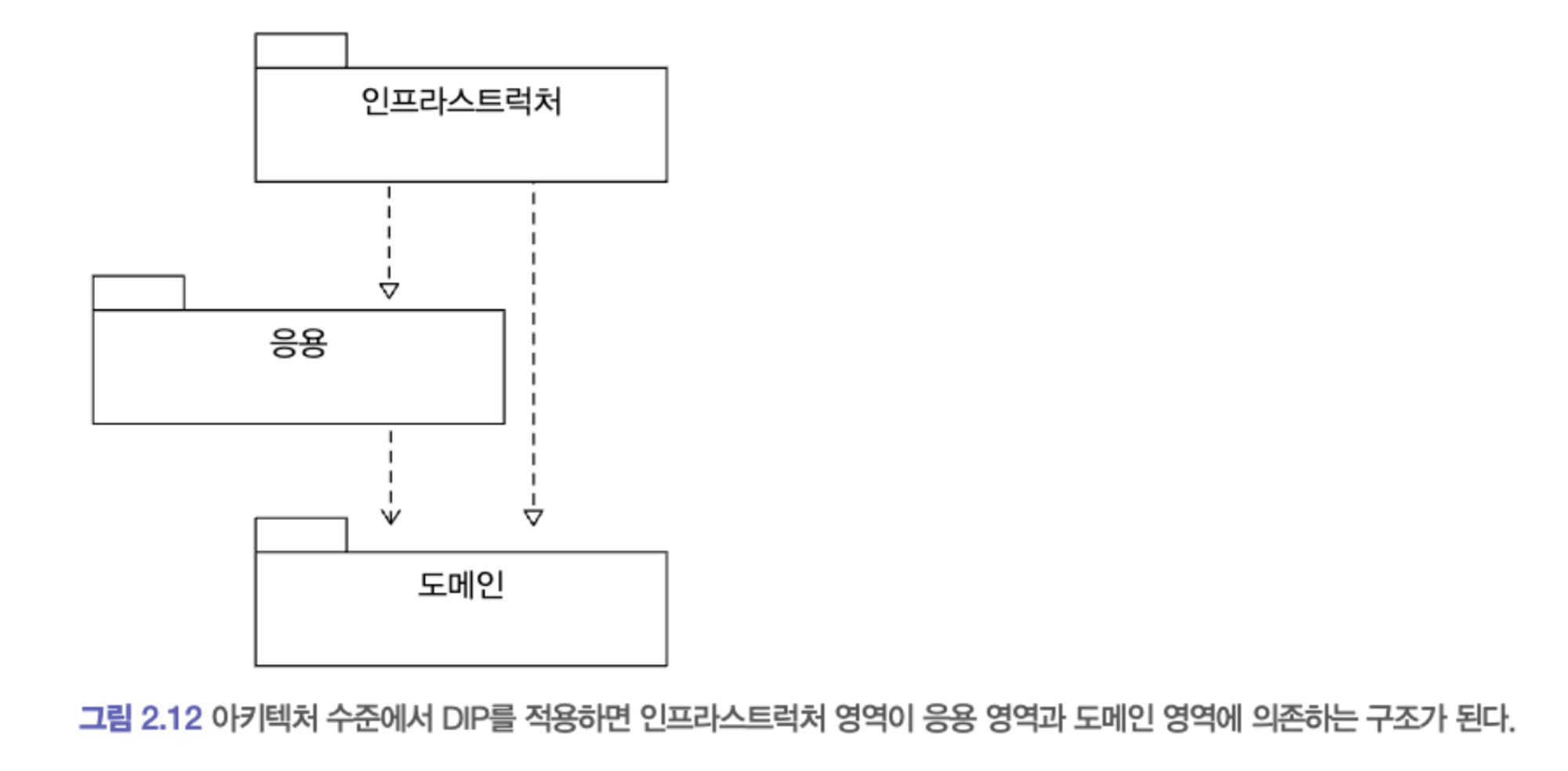 - 인프라스트럭처 계층이 가장 하단에 위치하는 계층형 구조와 달리 아키텍처에 DIP를 적용하면 [그림2.12]와 같이 인프라스트럭처 영역이 응용 영역과 도메인 영역에 의존(상속)하는 구조가 된다.