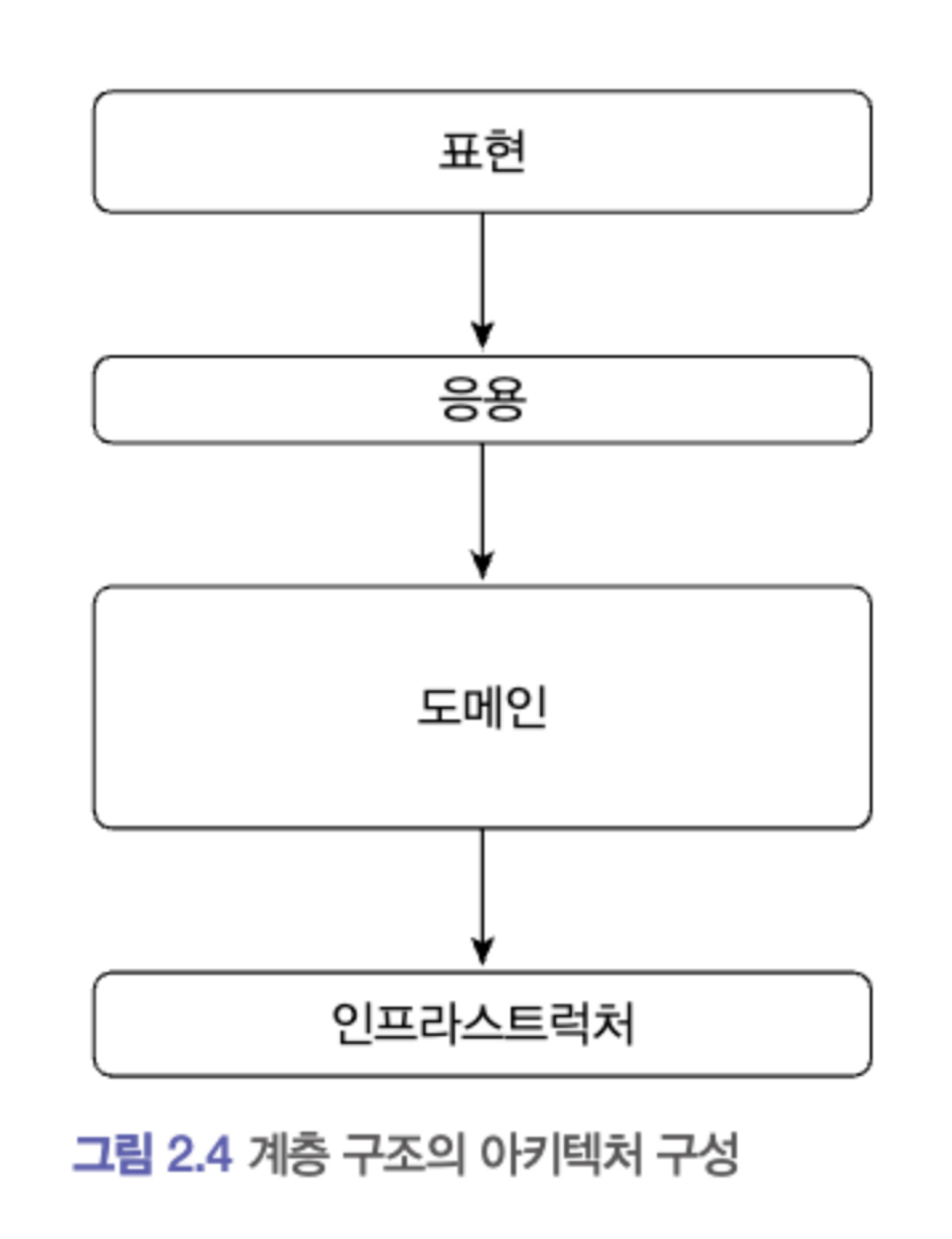 - 네 영역을 구성할 때 많이 사용하는 아키텍처가 [그림 2.4]와 같은 계층 구조이다.