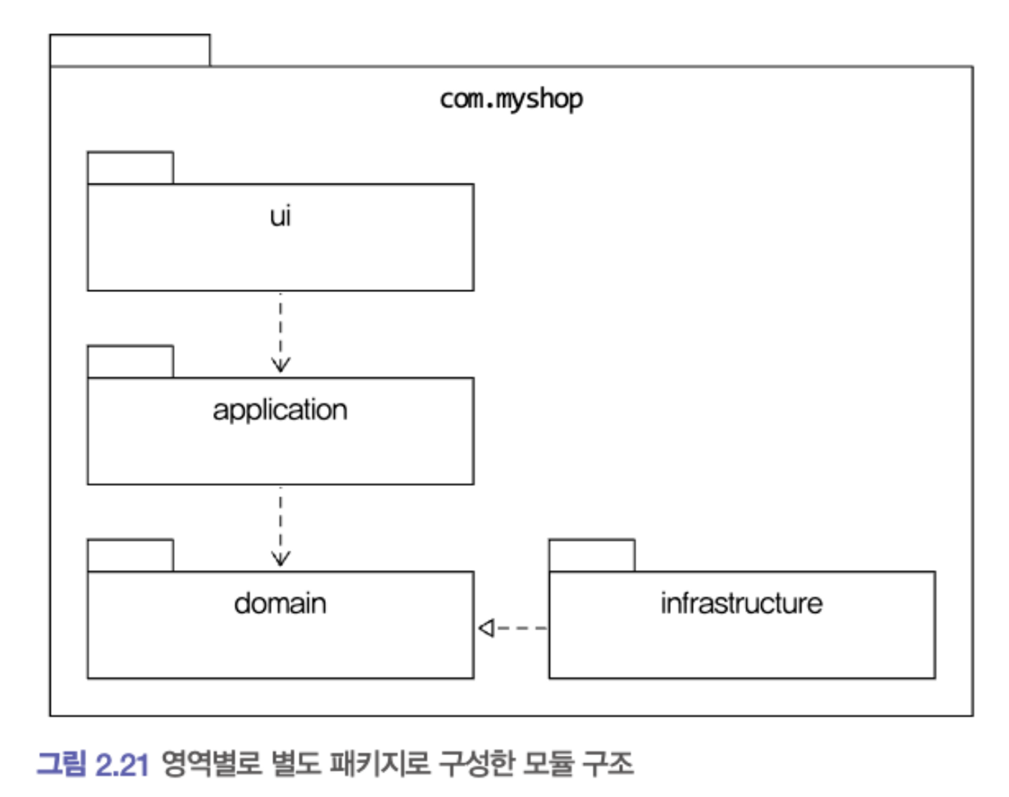 - 패키지 구성 규칙에 정답이 존재하는 것은 아니지만 [그림 2.21]과 같이 영역별로 모듈이 위치할 패키지를 구성할 수 있을 것이다.