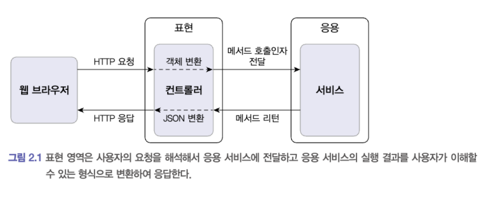 - 사용자의 요청을 받아 응용 영역에 전달하고, 응용 내역의 처리 결과를 다시 사용자에게 보여주는 역할(대표적으로 스프링 MVC 프레임워크가 여기에 해당)