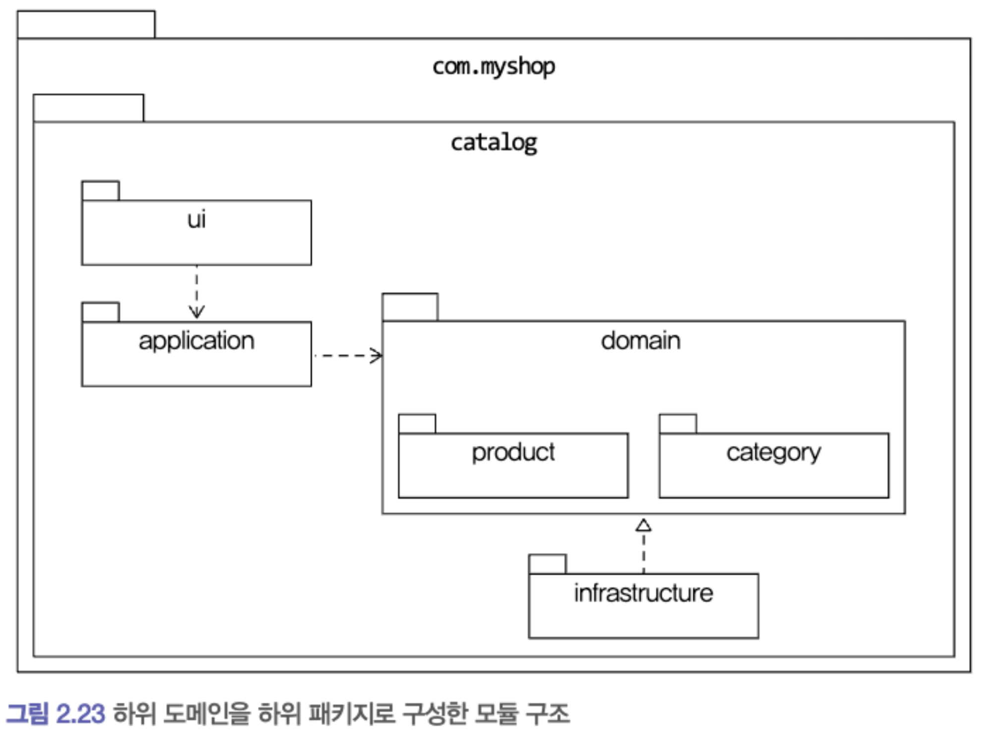 - 예를 들어 카탈로그 하위 도메인이 상품 애그리거트와 카테고리 애그리거트로 구성될 경우 [그림 2.23]과 같이 도메인을 두 개의 하위 패키지로 구성할 수 있다.