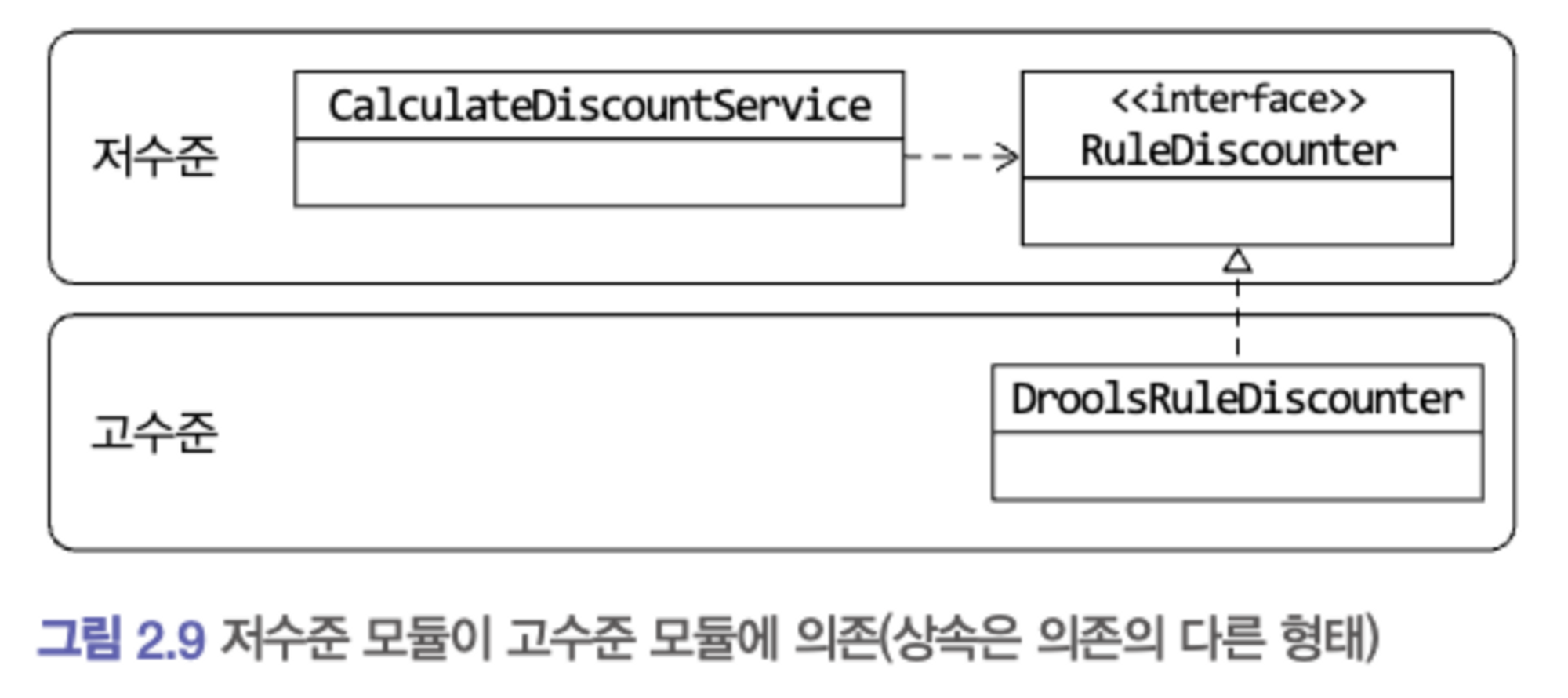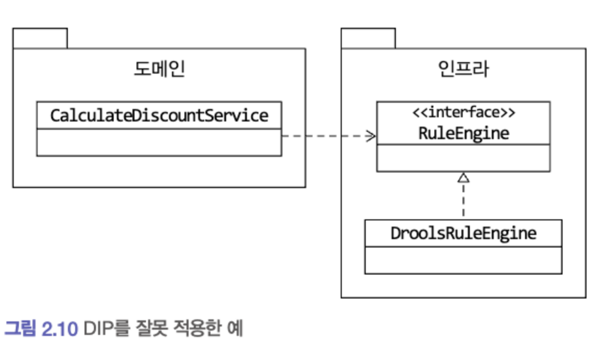 - [그림 2.10]은 잘못된 구조이다. 이 구조에서 도메인 영역은 구현 기술을 다루는 인프라스트럭처 영역에 의존하고 있다. RuleEngiine 인터페이스는 고수준 모듈인 도메인 관점이 아니라 룰 엔진이라는 저수준 모듈에서 도출한 것이다.