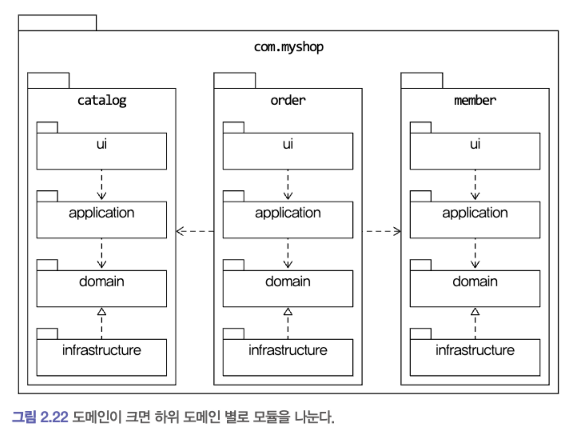 - 도메인이 크면 [그림2.22]와 같이 하위 도메인으로 나누고 각 하위 도메인마다 별도 패키지를 구성한다.