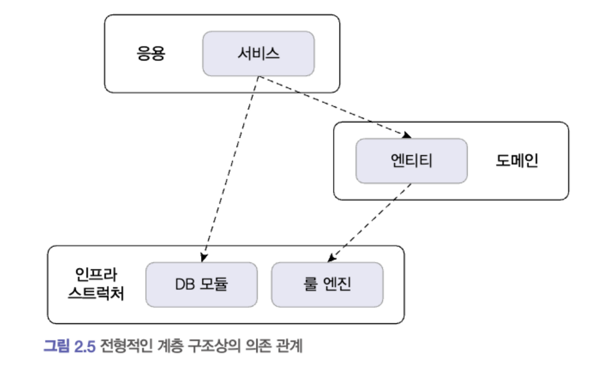 - 예를 들어 응용 계층은 바로 아래 계층인 도메인 계층에 의존하지만 외부 시스템과의 연동을 위해 더 아래 계층인 인스라스트럭처 계층에 의존하기도 한다.
