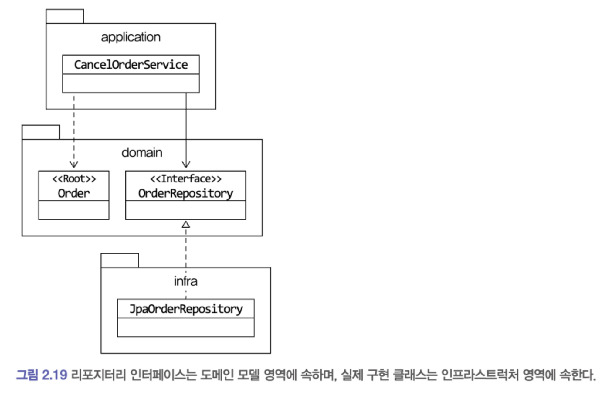 - 도메인 모델 관점에서 OrderRepository는 도메인 객체를 영속화하는 데 필요한 기능을 추상화한 것으로 고수준 모듈에 속한다.