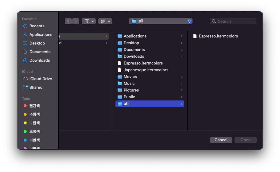 우측 하단에 color presets를 누른 후 import를 선택하여 util 디렉토리에 다운받은 espresso를 import해줍니다.